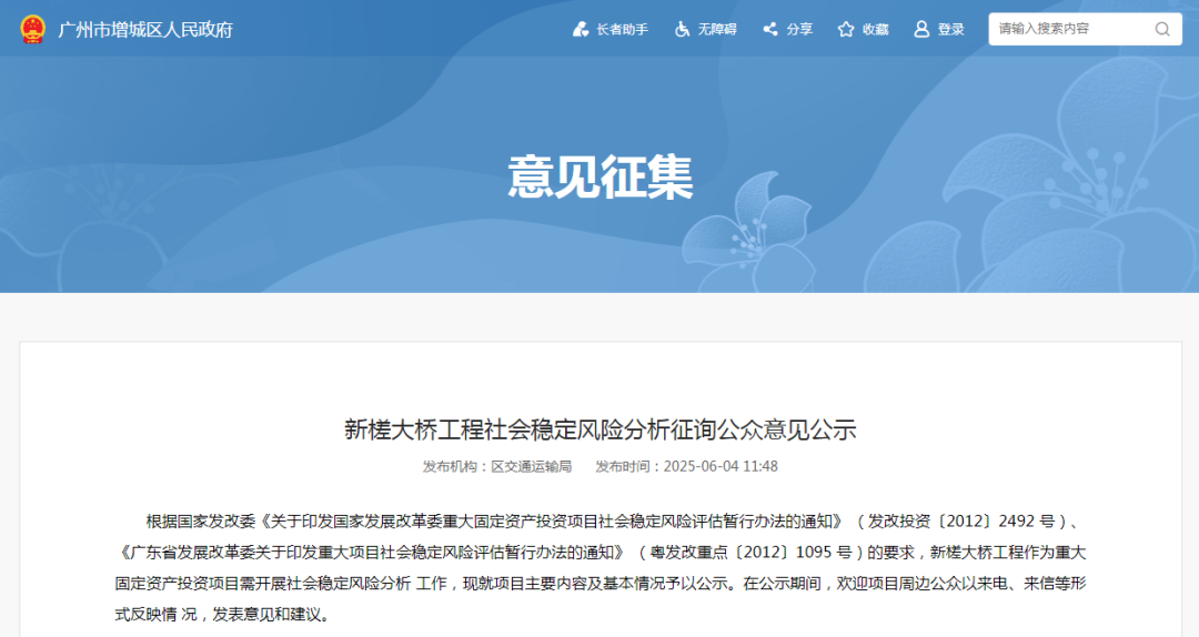 新槎大桥工程社会稳定风险分析征询公众意见公示